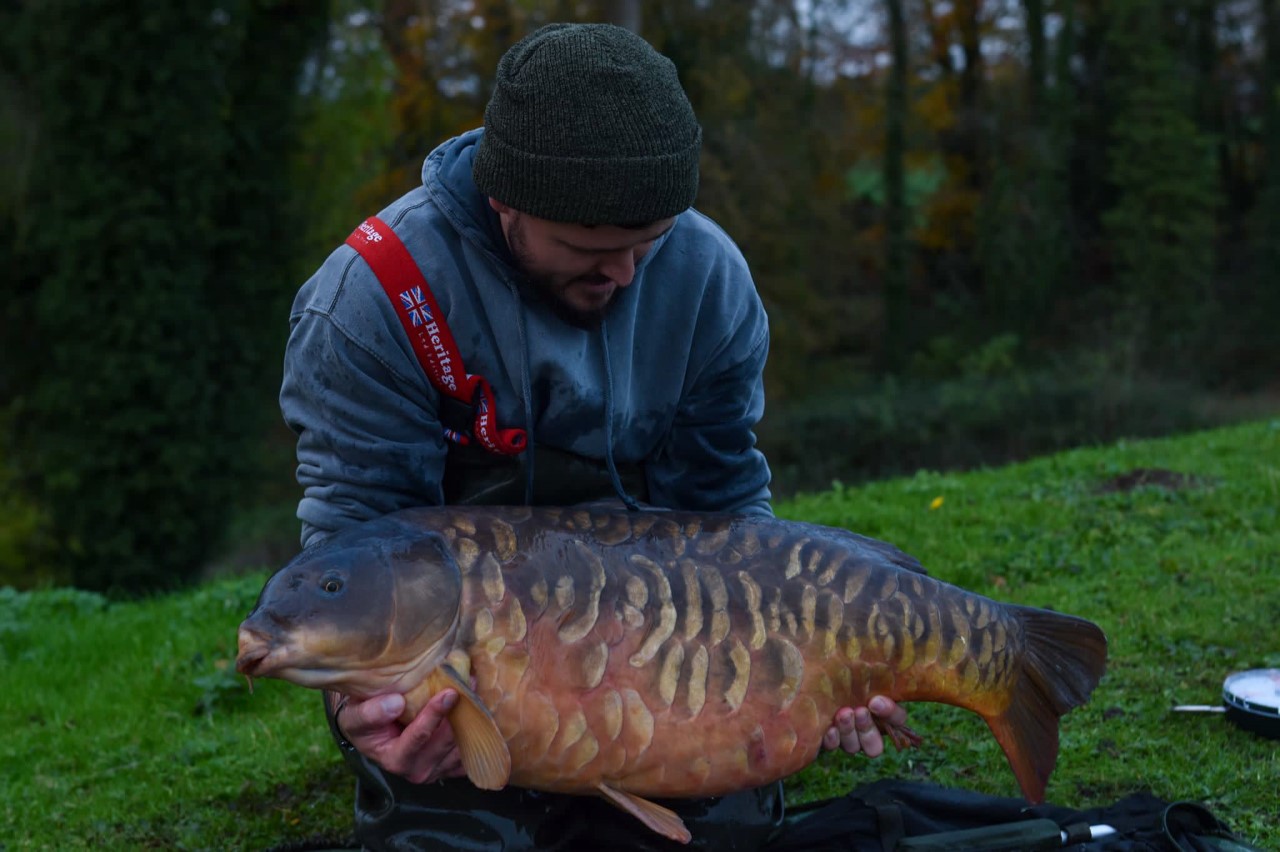 Keeping them safely in the net I repositioned one rod and just as I clicked the bobbin on to my disbelief I was away again, by this time I had a group of anglers behind me, one of them very kindly standing there with his spare net. After all, I bloody needed it! This fish felt heavy, surely it couldn’t be another ‘biggie’? As it got closer in the crystal clear water, big plated scales became present. I could tell from the voices behind me that I was connected to something a bit special and we were soon all staring down into matey’s spare net at a truly special carp.. Staffordhires finest ‘The Big Plated’ and at forty four pound i was blown away.