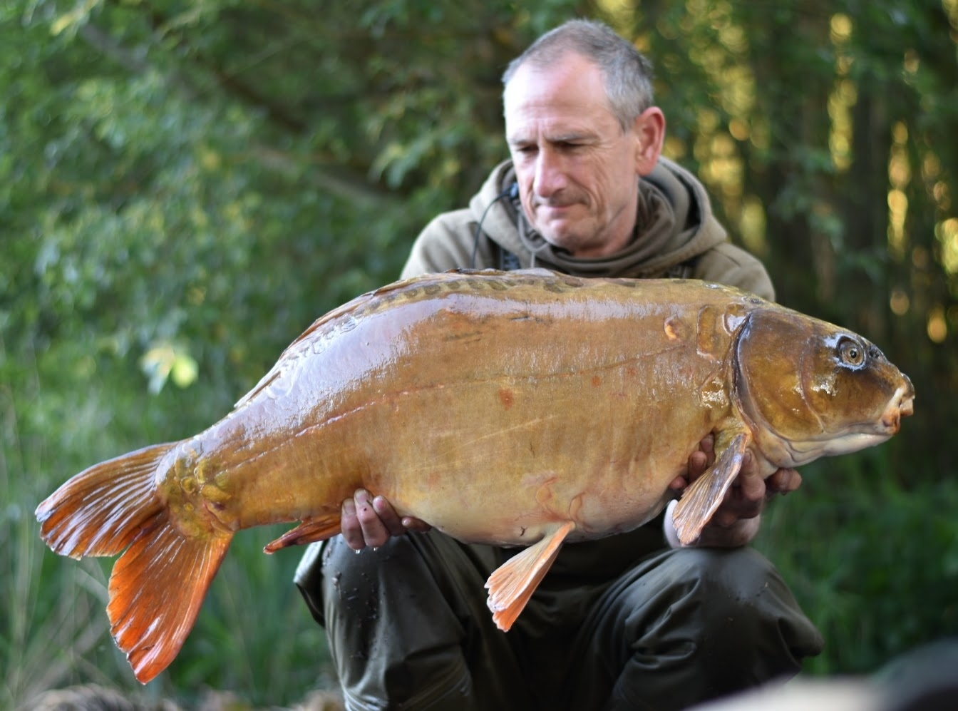 We hoisted my prize onto the unhooking mat and parted the mesh to reveal a big, old ghost carp known as Casper, one of Tyram’s proper characters. Up on the scales she weighed in at thirty seven pounds exactly and we fired off a few shots in the morning light before watching her swim off through the pads.