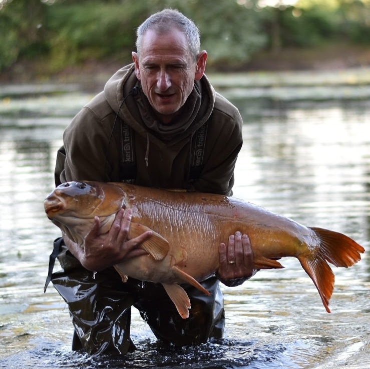 side of our pitch and as dusk approached we began to see more fish turn up in front of us, possibly drifting down the lake to escape the angling pressure around the plateau. As the light faded and the temperature cooled my right hand alarm suddenly signaled a take and after a short, uneventful fight I managed to bundle a dumpy, little, mirror of thirteen pounds into the net. The hours of darkness passed without event but at first light the same rod was away again! It was clear from the outset that this was a much heavier fish as it lurched around the snaggy swim trying to gain the sanctuary of the pads but I soon gained the upper hand and Wendy slid the net under my prize, a proper, old, dinosaur of a mirror, weighing in at 29lb 4oz! I was thrilled to bits, a real old, Yorkshire character with leathery flanks and battle scars galore! We fired off a few trophy shots before returning the old girl, who waddled away, none the worse for a bankside excursion! It was around five thirty am. and the temperature was already rising, we were heading for another scorcher!