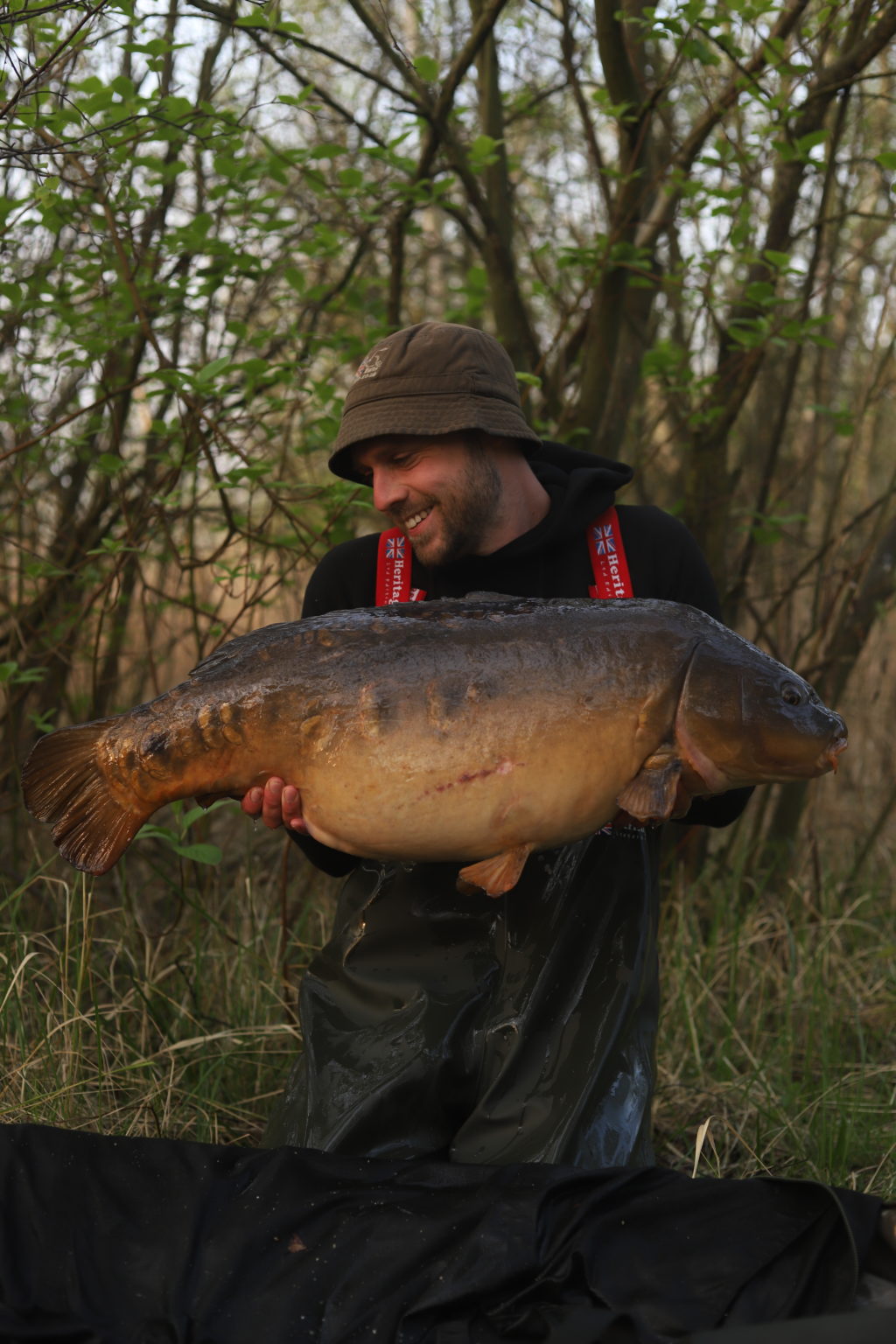 Early spring saw me concentrate my efforts on Northey, with eight fish coming my way which included one of its smaller sisters to the big girl, a fish known as ‘Nuggets’. The lake shuts for the month of May, so on I went to another one of the lakes I had joined. A very special venue, that I felt very privileged to be invited to fish. Well I actually only did one night on said venue, which in one respect wasn’t quite how I wanted things to pan out, as I hoping to enjoy my time on there, catching many of its residents and seeing all four seasons on that particular lake. The day I arrived at the lake, it was very quiet, in fact to my amazement there was only one other person on. I found four very large residents feeding in a corner, absolutely ripping the silty bottom apart. With no chance of getting a rod on them, I had to set a rod just off them and hope that when they circled the area, they would come across my heavily baited patch. Well they did exactly that, as I watched up a tree, the carp vanished from site, only for me to wander back to my rod back round the corner. Not two minutes since standing back at my rods, it was away and I did battle with the king the pond, the mighty ‘One Eye’. A fish that could well be over forty even touching fifty years of age and tipped the scales at just over 41lbs, certainly the best carp I have ever caught, and I feel blessed to have that fish in my album!