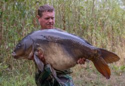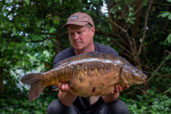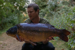 up and started feeding on the spot. ‘SHIT’, ‘NO’ I thought, but they were soon forced out of the way, as the enormous common I regularly saw, and a mirror came in on the act. The mirror was soon to show he was boss and sat right over the spot, right on top of my hook bait. It mouthed the bait very slowly and cautiously, sucking and blowing. Not tilting as it was feeding up the shelf. This seemed to go on for ever, then WALLOP. The rod flew forward on the ground, the reel spinning. I charged forward down the slope to my rod and lifted into one very pissed off, powerful carp. I dipped the rod and gave it plenty of side strain as it powered out into open water. It was like an express train. The swim was very tight and didn’t allow for me to lift my rod vertically, so I stripped down to my pants, so I could walk down the shelf to give me more room to play the carp comfortably. After a mental battle the big dark mirror slipped over the net cord. That was mega. What a scrap. Soaking wet with sweat and lake water, I peered into the net at my prize. Not one of the originals I was after, but a nice dark framed mirror that had lived in its home for at least twenty-five years. I secured her in the margin, got dried and dressed and prayed that I could get the photos done and return her before anyone saw me. To curt a long story short, I didn’t get away with it. One lad saw me as I just put her back and the bay was soon filling up with anglers. I decided I would do the night in Phil’s Corner just to protect the spot more than anything, even if the anglers were now cutting me off. The proper carp were back that evening surprisingly but managed to avoid my hookbait. They were all over, right until dark, when I could see no more. I went to bed that night wondering why I hadn’t had another bite, thinking that something must be wrong.