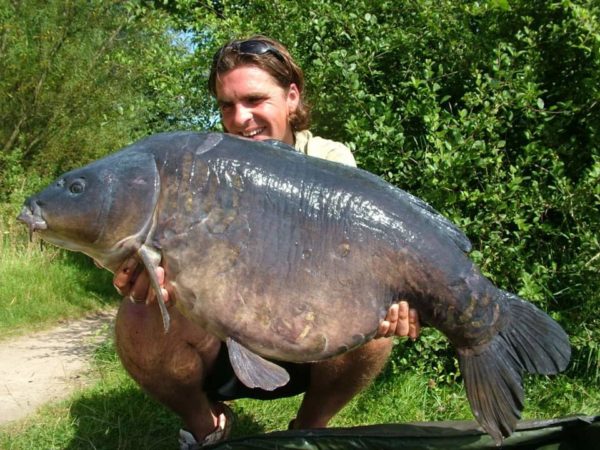 cradled her the waters edge in the euro mat. We were both about to say our good byes to Scaly when I got a few bleeps on my right hand rod over the tigers and hemp. Before I could do anything my rod starts to slowly peel off therefore I pass the mat to Nath who puts Scaly safely back into her safe sanctuary. By the time I get to the rod the spool is just ticking over due to the tight clutch to stop the fish going in to the channel which is directly behind the area that the trap was set. I pick the rod up and it was like hitting a snag completely solid but moving at the same time kiting away to my left along the front of the island with some real power this fish was not a happy bunny! Nath comes over “you in” he asks I reply with “yes mate Slate” I reply he does not believe me and it was only a wild guess but having caught this fish 3 years previously I knew what it was capable of and it was really taking me for a ride. I just could not stop the fish it was moving so quickly and with so much power it was just a case of hanging in and see what happens, it could go either way, but I knew that I had to try and turn it around. I need to act fast as there is a small island to my left and buoys that are held down with steel chains that are covered in razor sharp mussels which could cut through mine line in a flash and if the fish gets close to these I knew it would be game over. I knew I had to do something before it reached these areas so it was time to give the Slate a bit of his own medicine. I tried to tighten up and hopefully start to gain some line back as the Slate has taken some 50 yards of line. I managed to guide this brute of a fish in front of the small island which is a real god send at this stage but the fish is still not out the danger area as the buoys and the razor chains was now the next obstacle that I had to deal with. It was all getting rather scary! At this point Slate was in control and all I could do was to not let it gain anymore line and try and fight rod and line with power of a big angry carp. It was time again to start and try and regain the battle I tighten the clutch and with the power of the 12ft 6” 3.5tc rods I start to wind up the line is bow tight the rod is creaking. I manage a couple of turns on the reel, more stretch than anything but slowly the fish is no longer taking the line and before I know it I have managed to turn the fish around. I know in my heart that the first turn is the crucial one and with this I feel for the first time that I am in control of the battle. I am gaining line slowly but its all counts. A couple more lunges from the powerful carp but nothing I cant handle. I now feel that the battle is won but I just need to bring it back safely to the net. By this time Nath is standing by with the net waiting to pounce on our quarries. All kinds of thoughts are going through my mind “please don’t come off”. I know I trust my rigs and the fox series 5 hooks to stand up to the challenge having caught loads of fish on the ultra sharp long shank hook which very rarely lets me down. I manage to get a glimpse of the great fish and the big scales on the shoulder indicates what I had thought all along SLATE GREY! Nath cannot believe it; he is more excited than myself! I know there is still work to be done as its not yet in the net my legs again have gone to jelly and my heart is racing. A few more turns on the reel and I know that its now ready. Nath gets into the water on the shelf and calmly slips the net right under the fish at the first attempt we both let out a massive “YES”. We both jumped around absolutely shocked to what was happening! I then get into the water to get a good look. Slate looks absolutely mint and looks a good weight too, the big scales across this great carps shoulders and back which can only be described as body amour for carp! What a sight and what a moment for myself and my net man Nath.